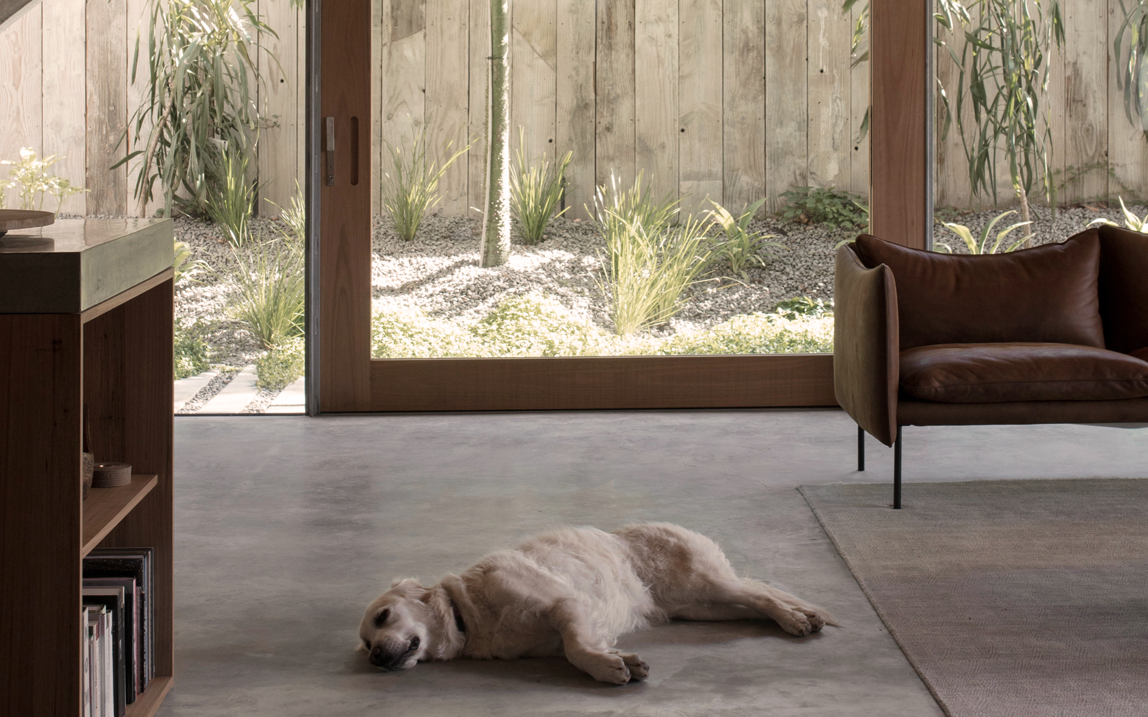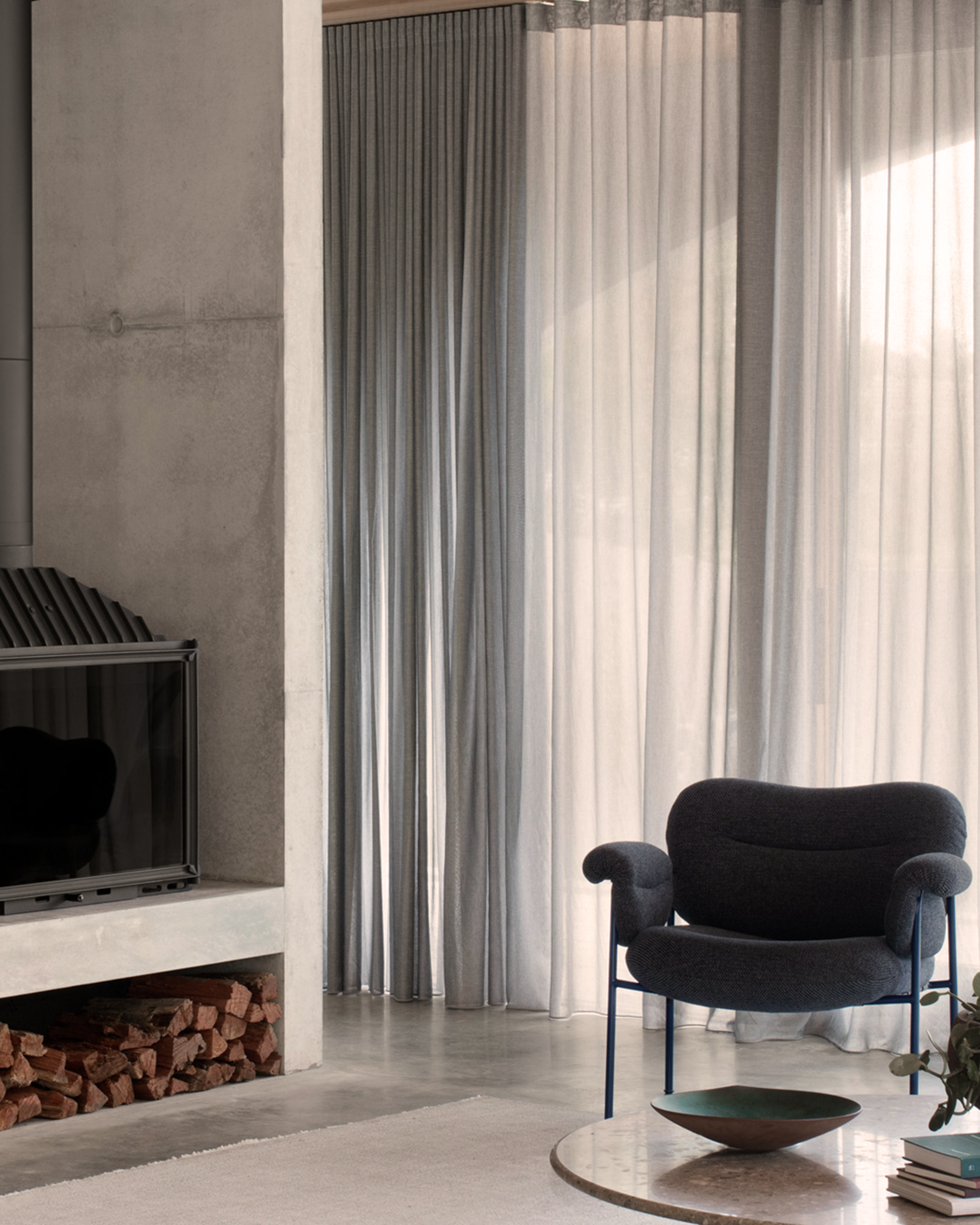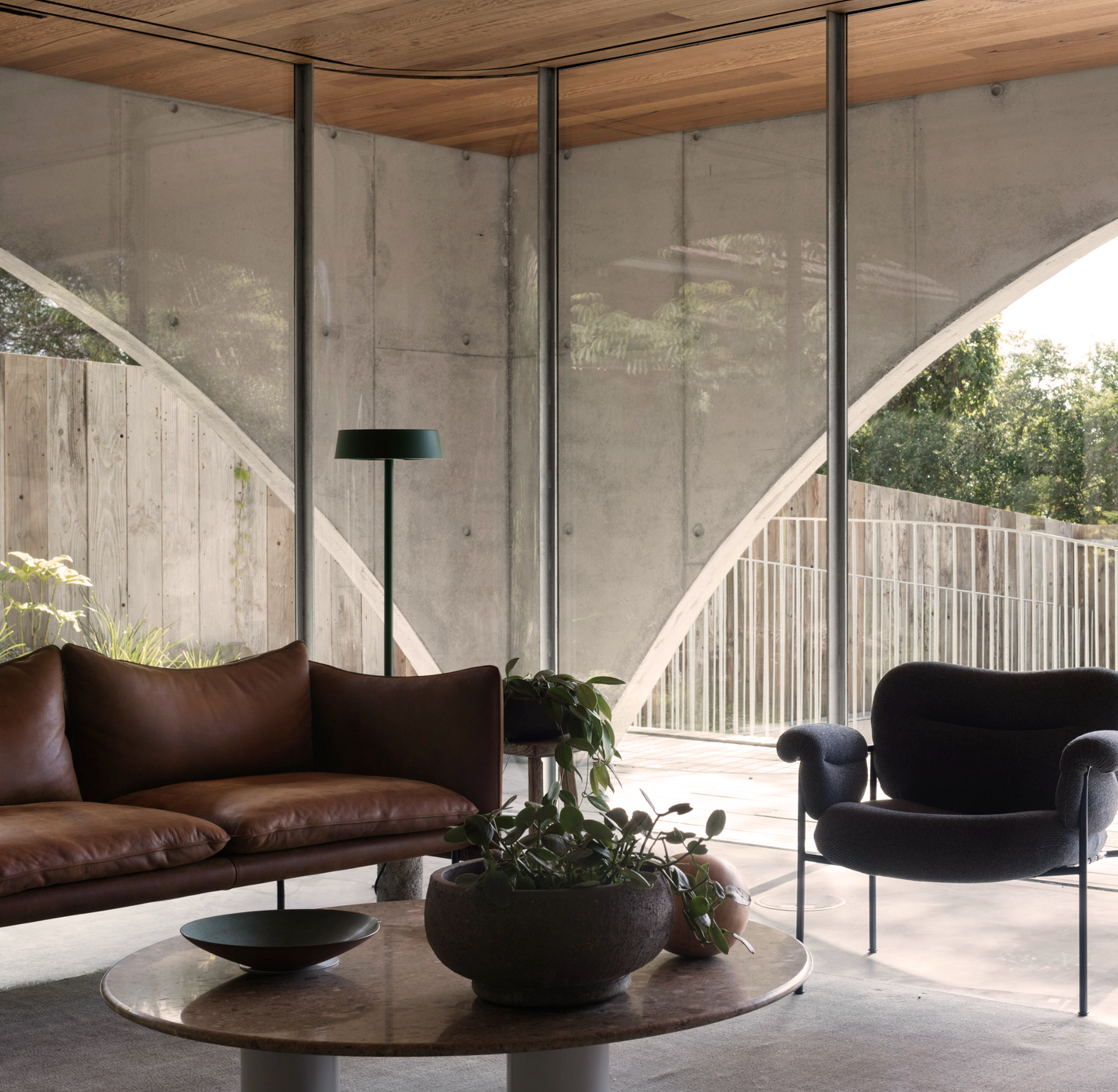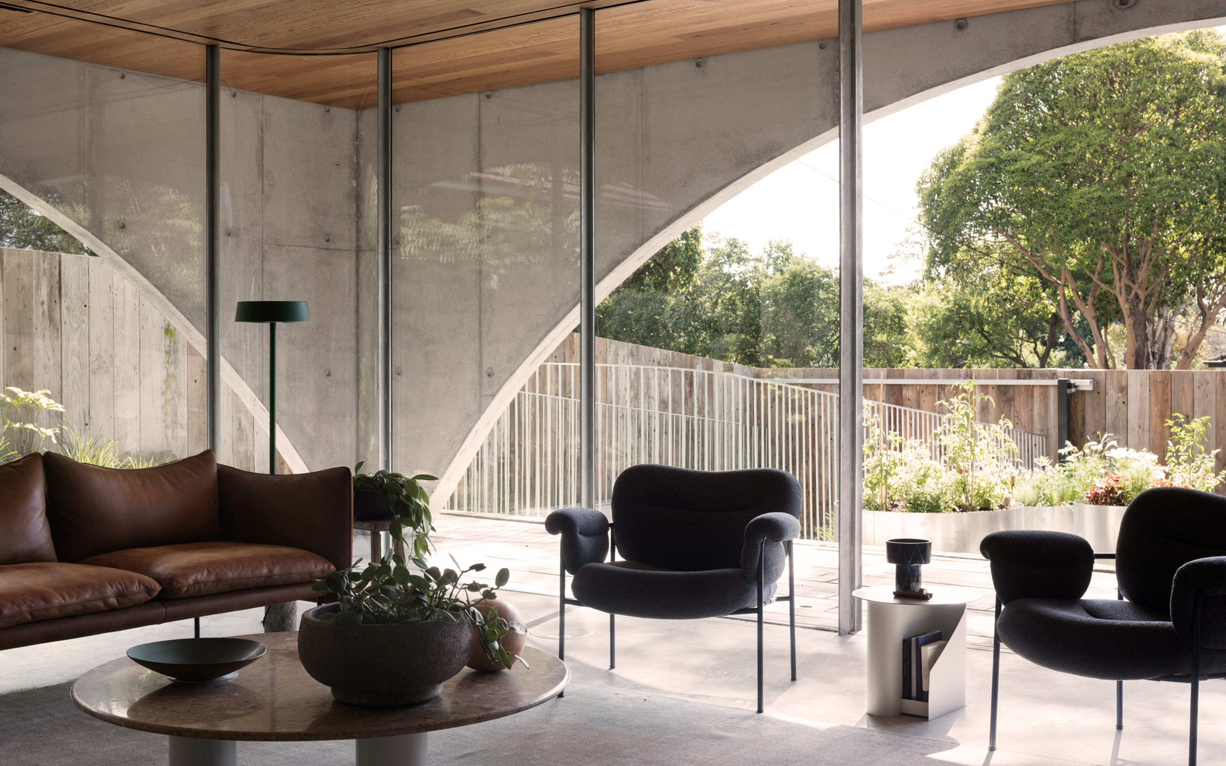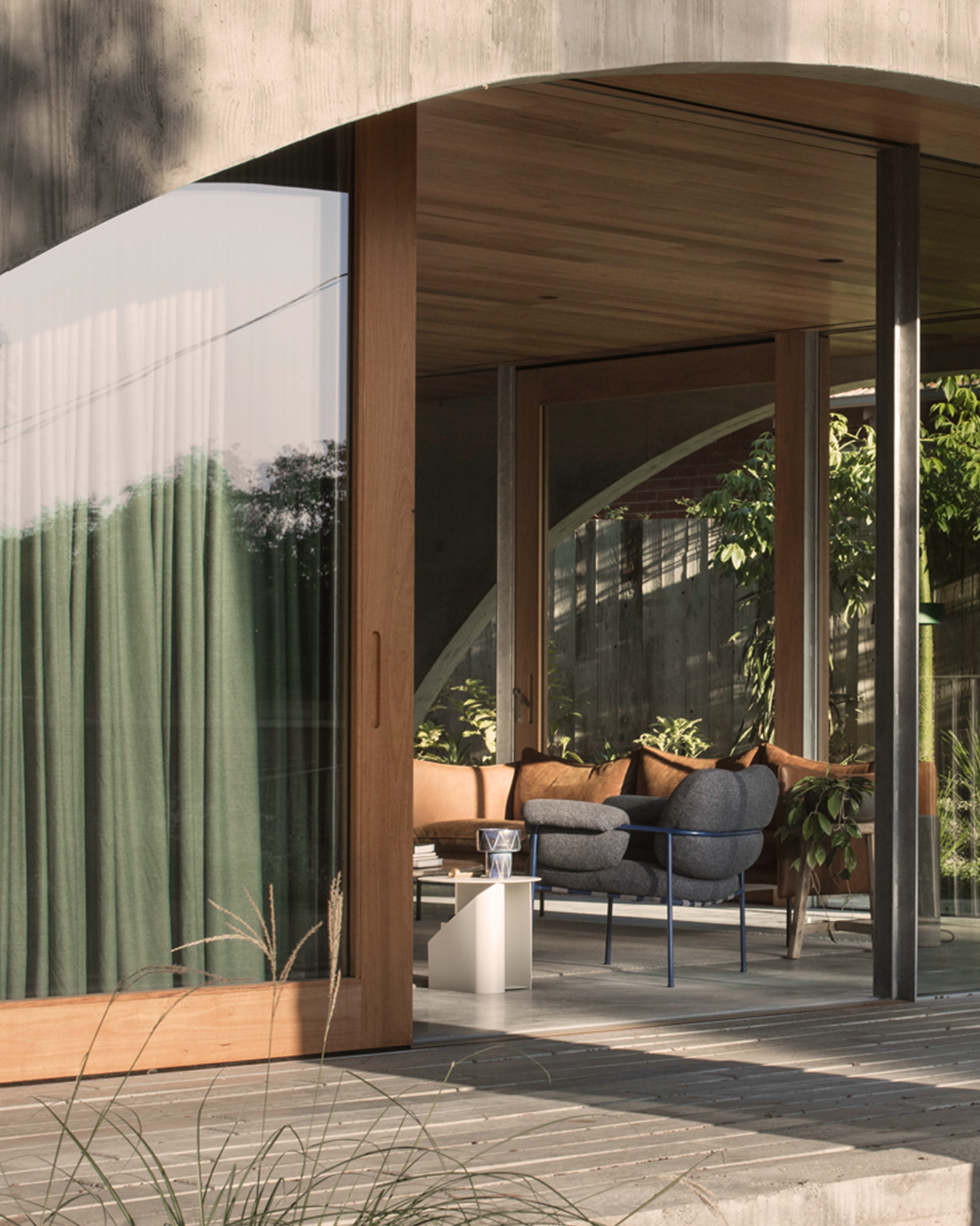 Inside, the dwelling spaces are light and spacious with minimal decoration and furniture, including The Tiki sofa and Bollo lounge chairs that has been selected to reflect the balance of heavy and lightness. Timber, glass and concrete forms the interior colour palette, and rounded, glazed corners adds softness.