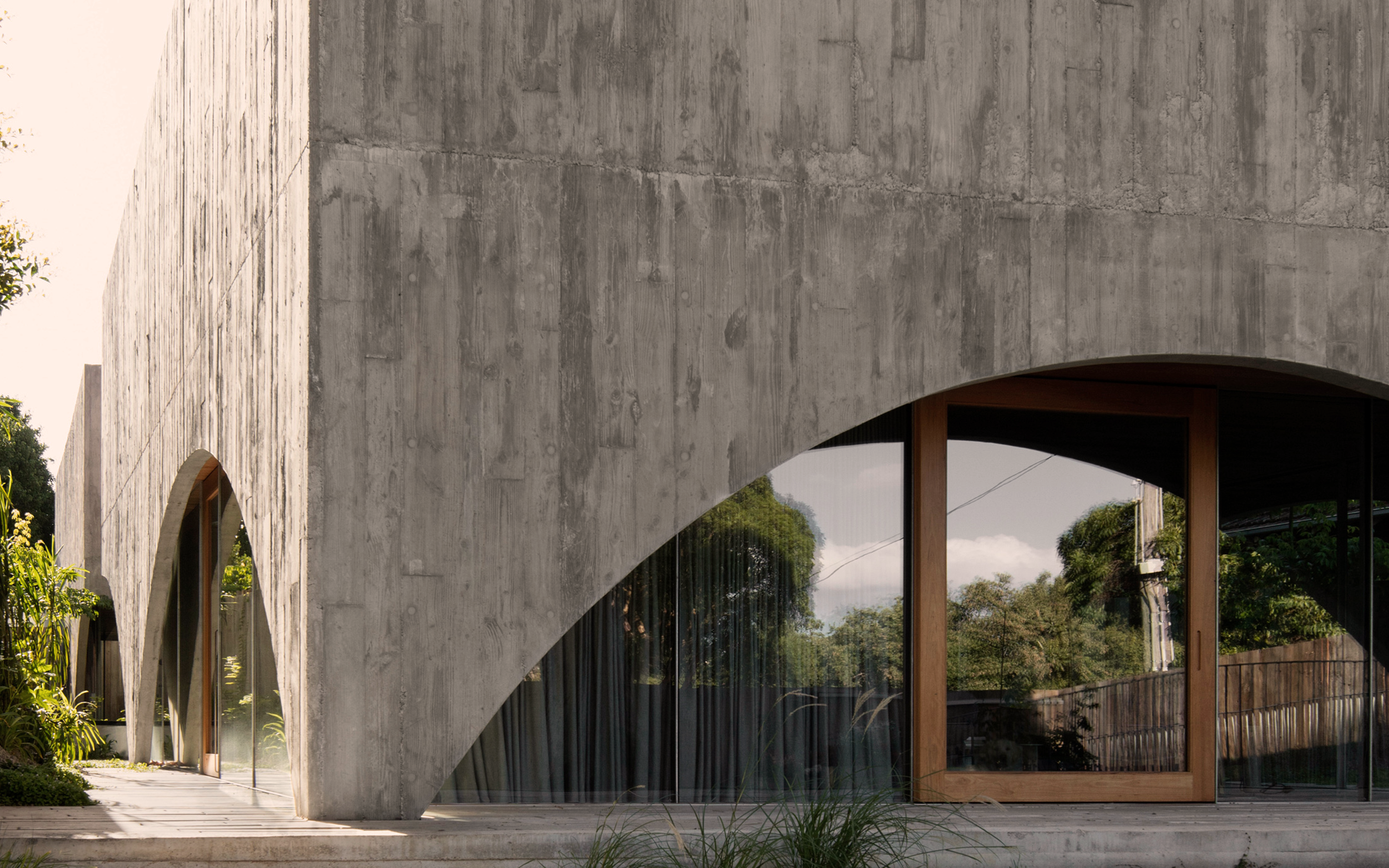 The award-winning concrete statement building nestles between two outer shells, framing and capturing light and contrasting with the soft greenery on the plot of land it occupies.